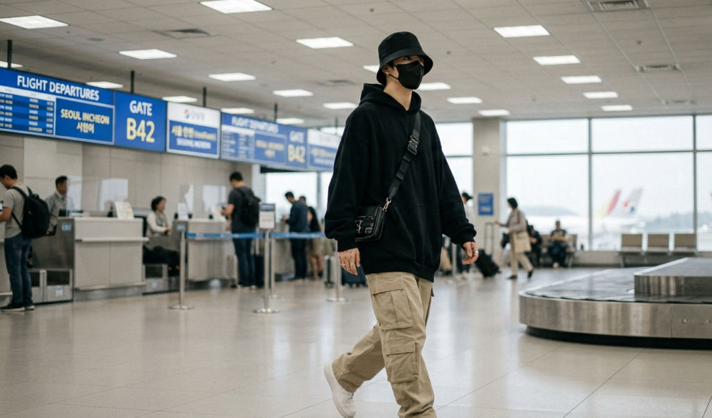 Sometimes, “less is more.” Mimic the members’ iconic airport fashion with oversized hoodies, bucket hats, and high-end designer basics. This is the ultimate “cool girl/guy” aesthetic. It’s comfortable for a long day of queuing and looks effortlessly chic in photos.