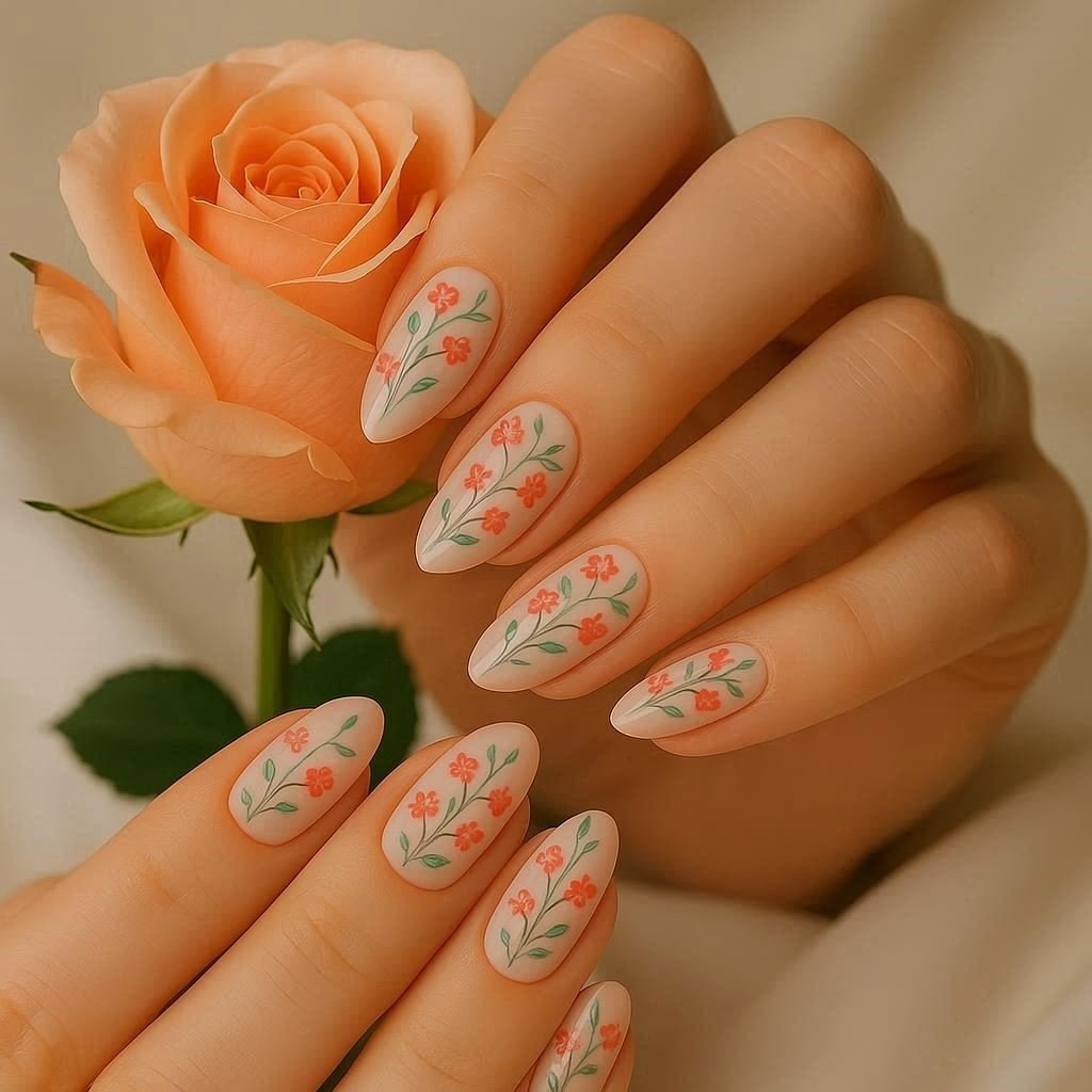 For those who adore nature, this one’s pure magic. Think of a young woman holding a rose, her nails painted with tiny vines and blossoms in coral and mint green.