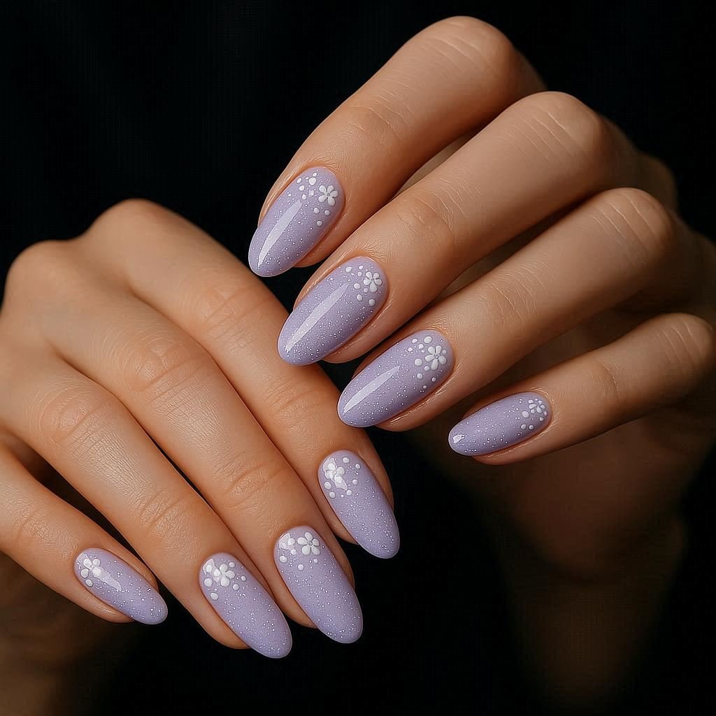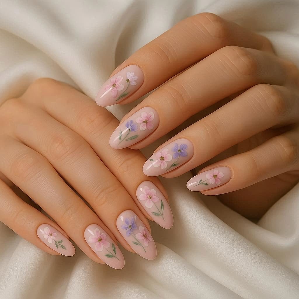 Imagine a young woman’s elegant hands resting on smooth white silk her nails painted with soft, hand-painted floral art in shades of pastel pink and lavender.