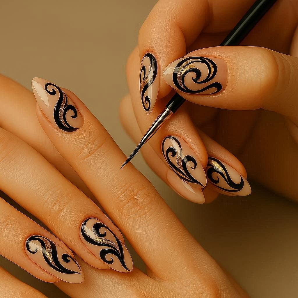 Now, for those who like their nails with a little drama. Picture a close-up of gold and black freehand swirls, fluid, striking, and undeniably modern.