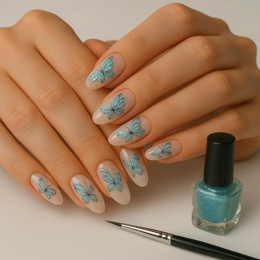There’s something freeing about butterfly nails, maybe because they symbolize transformation and beauty. Picture delicate turquoise and silver butterflies, painted freehand with a tiny brush, across gently clasped hands.